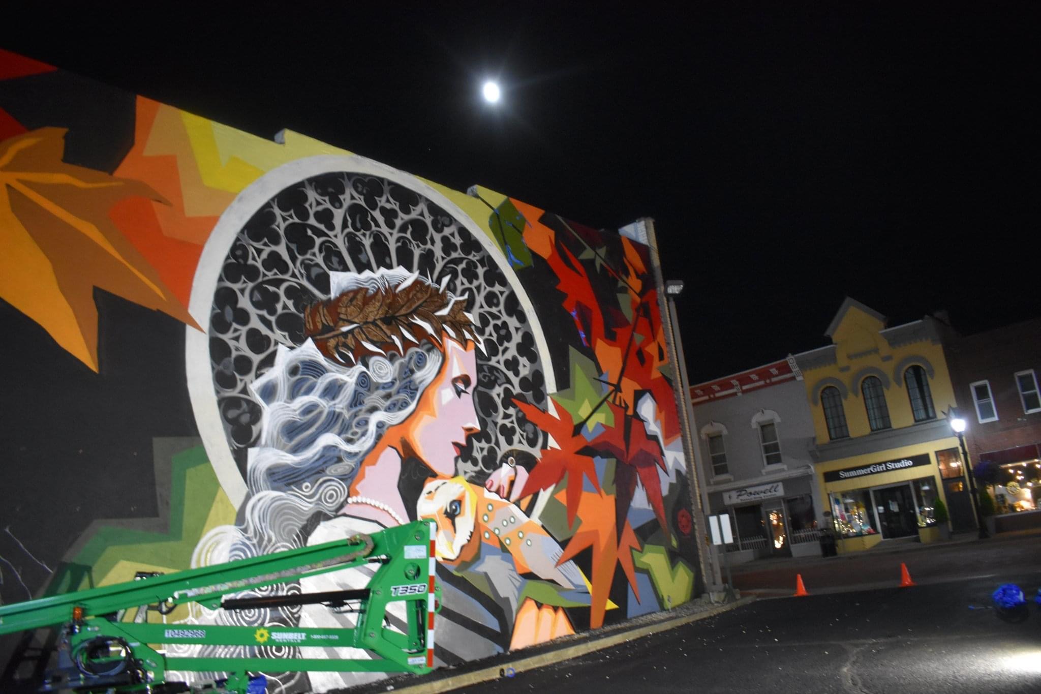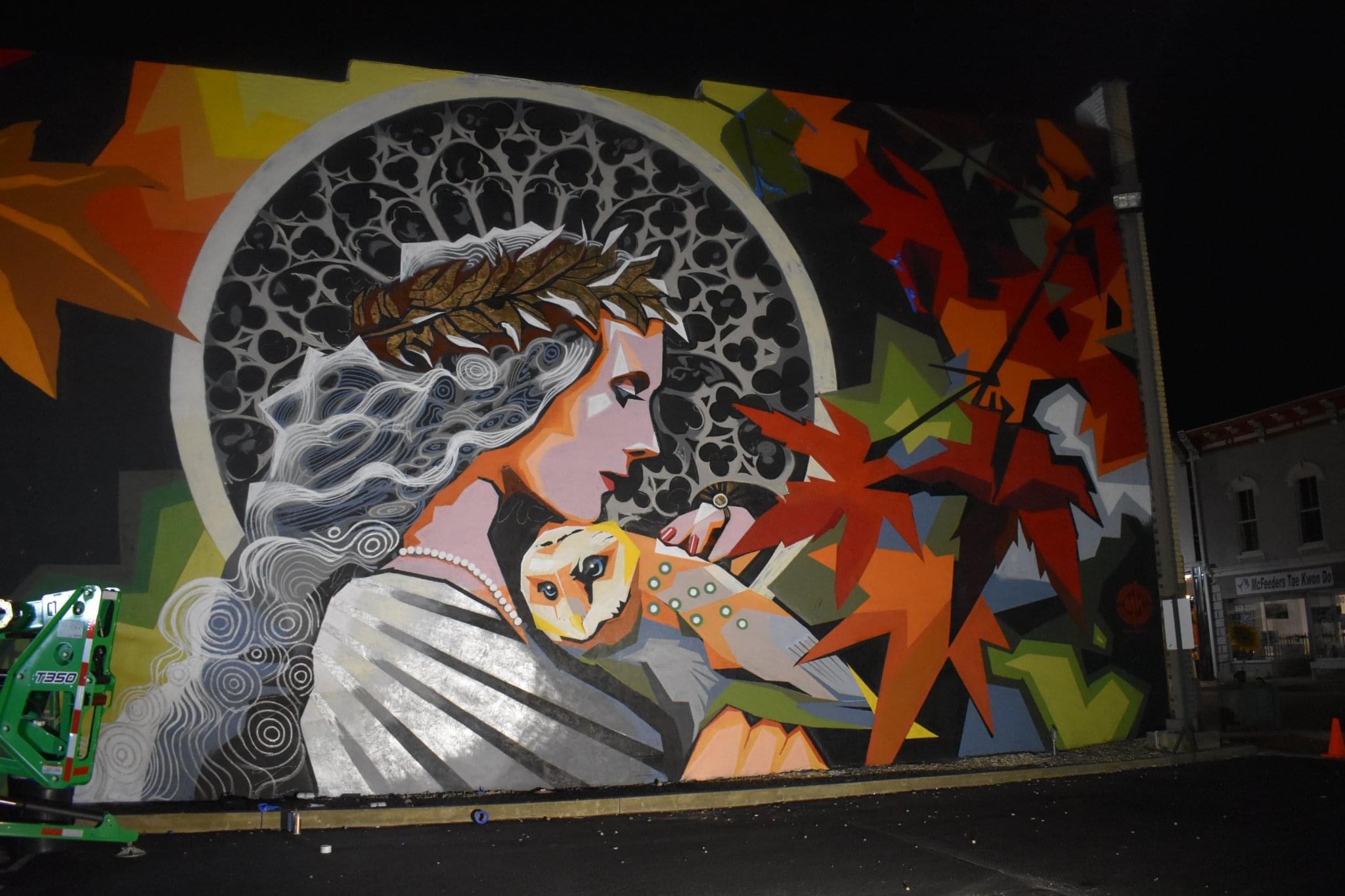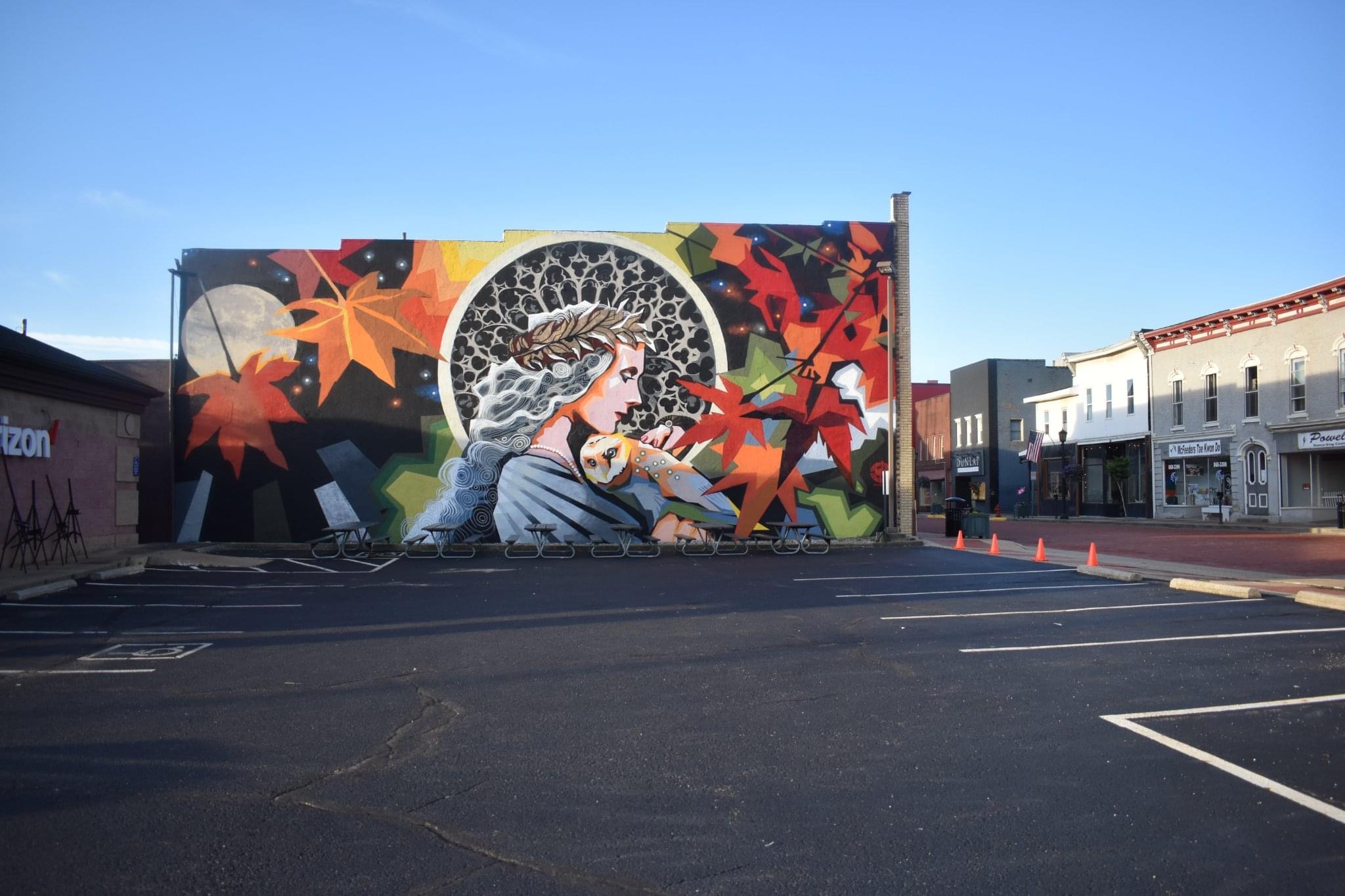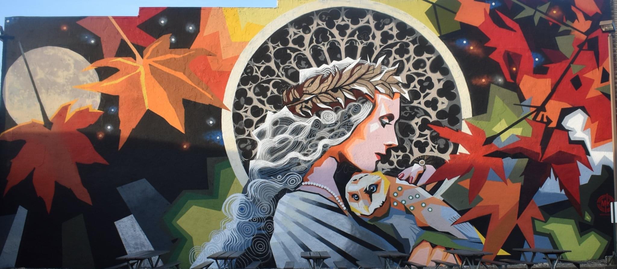 Created by professional artist and Minerva Native Matt Kress, this mural is located at the entrance to the village’s historic downtown and pays tribute to the village’s namesake through powerful imagery inspired by Roman mythology. Sponsored by Minerva Arts Council, Visit Canton, and the Village of Minerva and with cooperation of building owners Cherrie and Tim Matthews, the artwork features the goddess Minerva -symbol of wisdom and war- alongside her iconic owl companion. While the village was actually named after Minerva Ann Taylor, not the Roman deity, the mural embraces the mythical connection in a bold and timeless way.