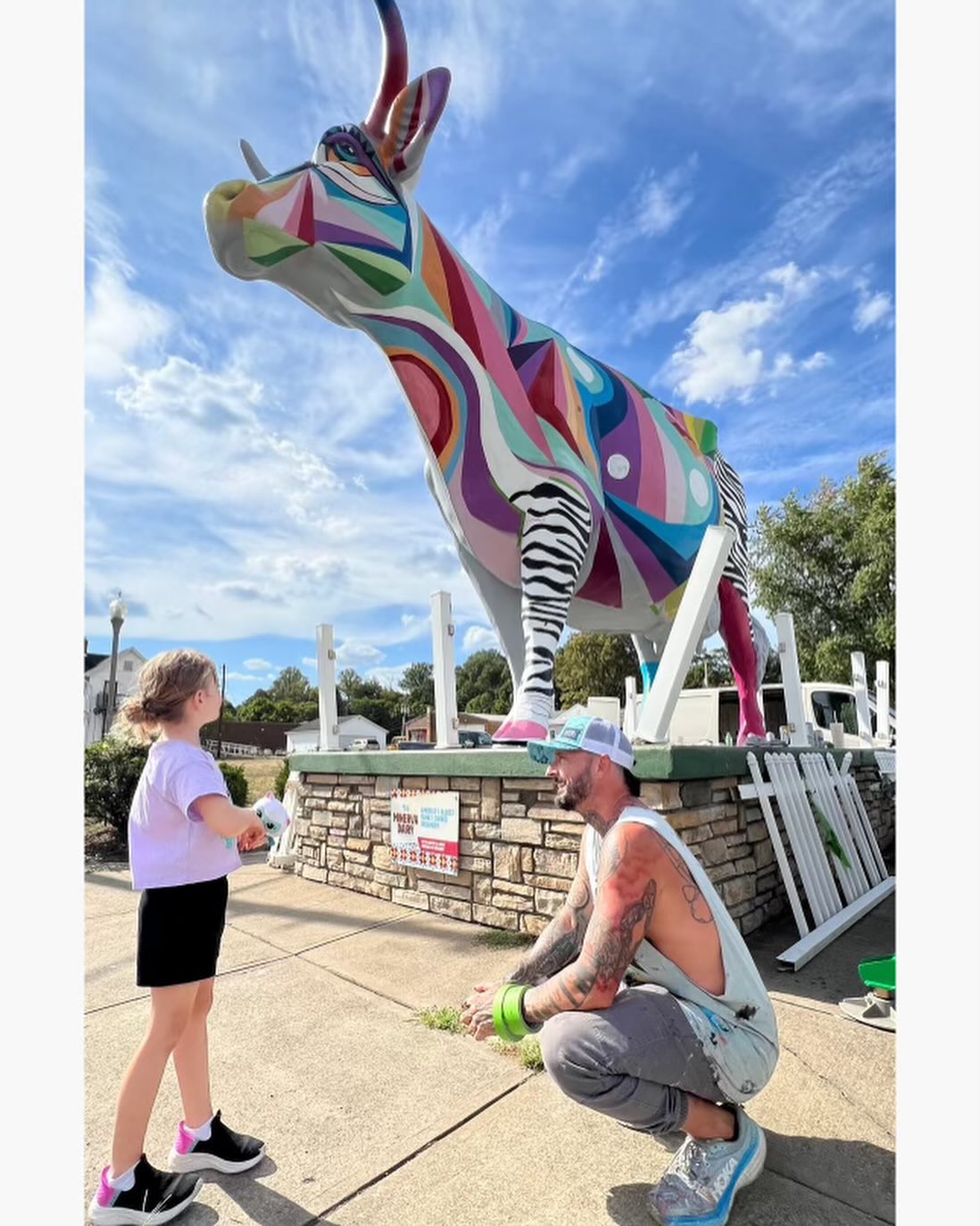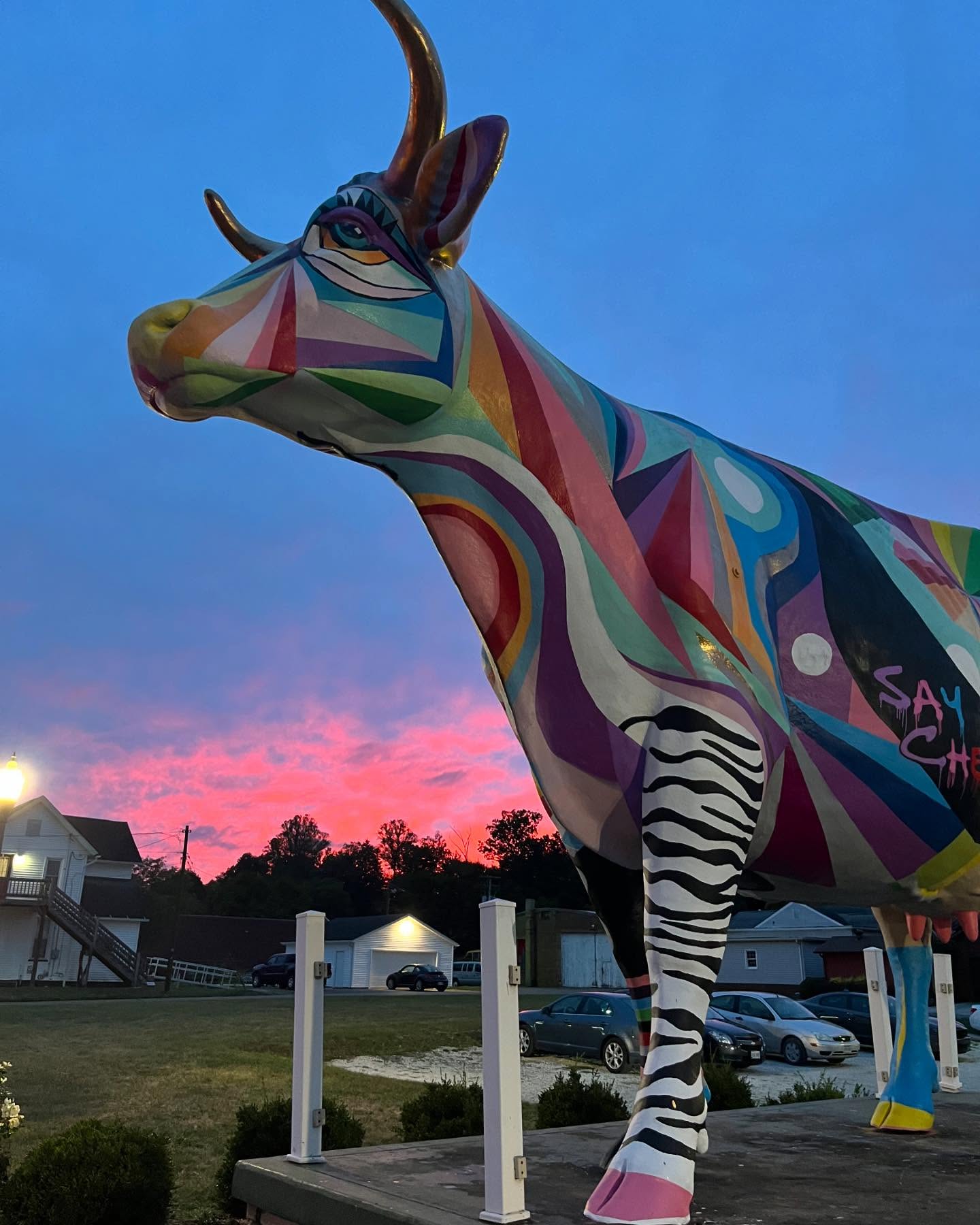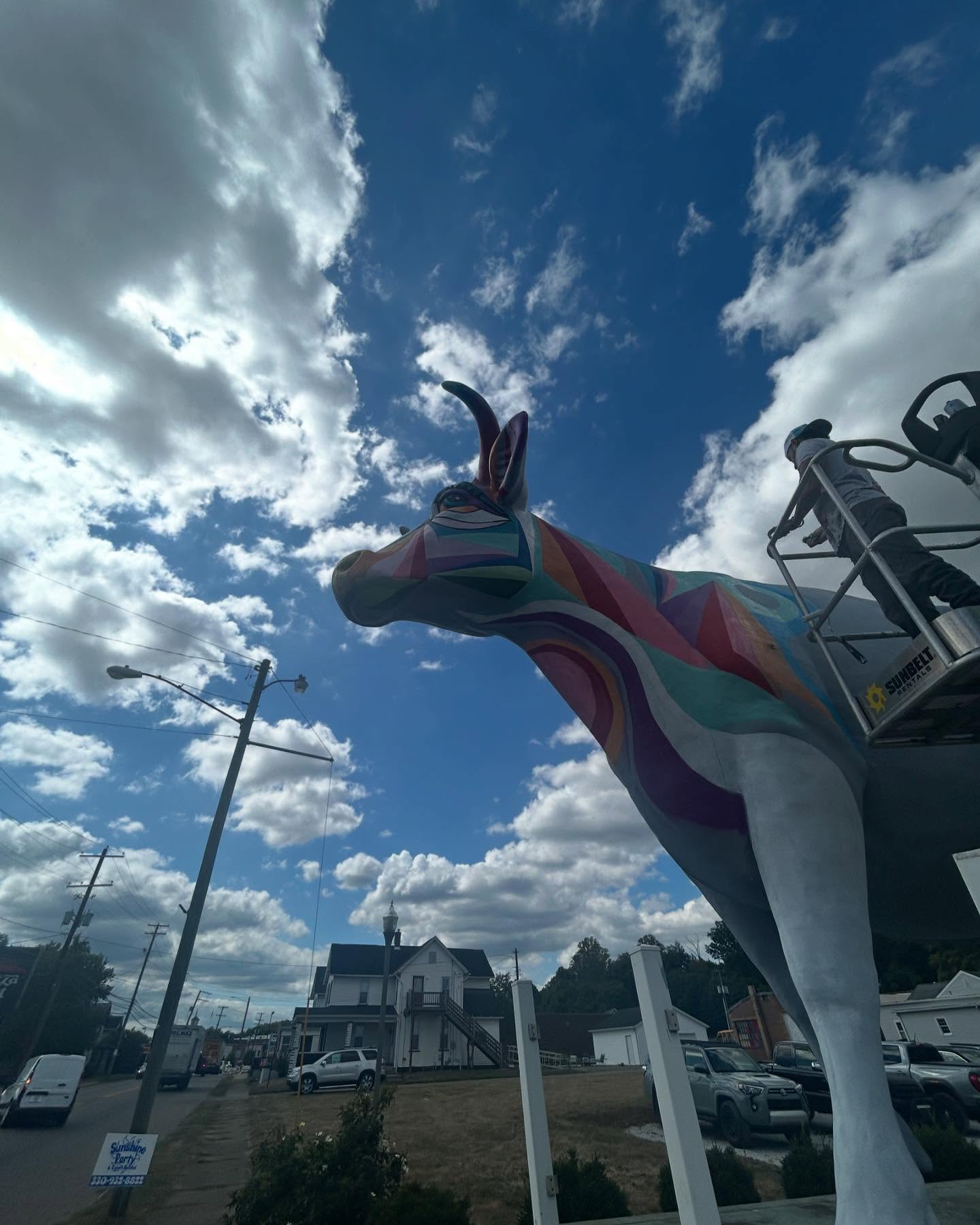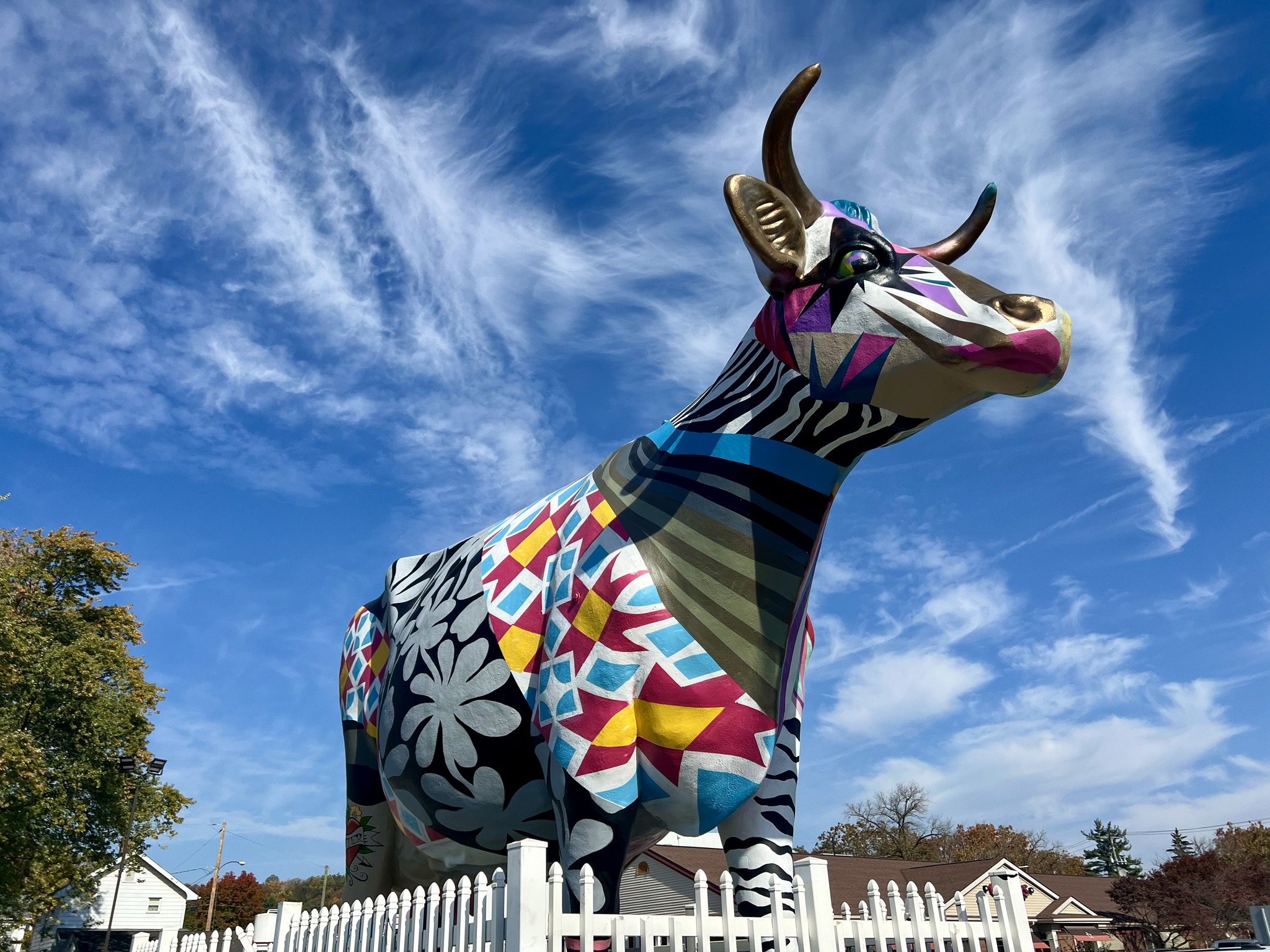 Picowso is a bold and colorful cow sculpture painted by Minerva native and muralist Matt Kress. Inspired by Picasso and the Minerva Dairy’s iconic butter packaging, the piece blends cubist art with local heritage and playfulness. Minerva Arts Council and Minerva Dairy commissioned Kress to reimagine Lacey May, the Dairy’s larger-than-life and traditionally black-and-white cow who has stood on the Lincoln Highway since 2006.